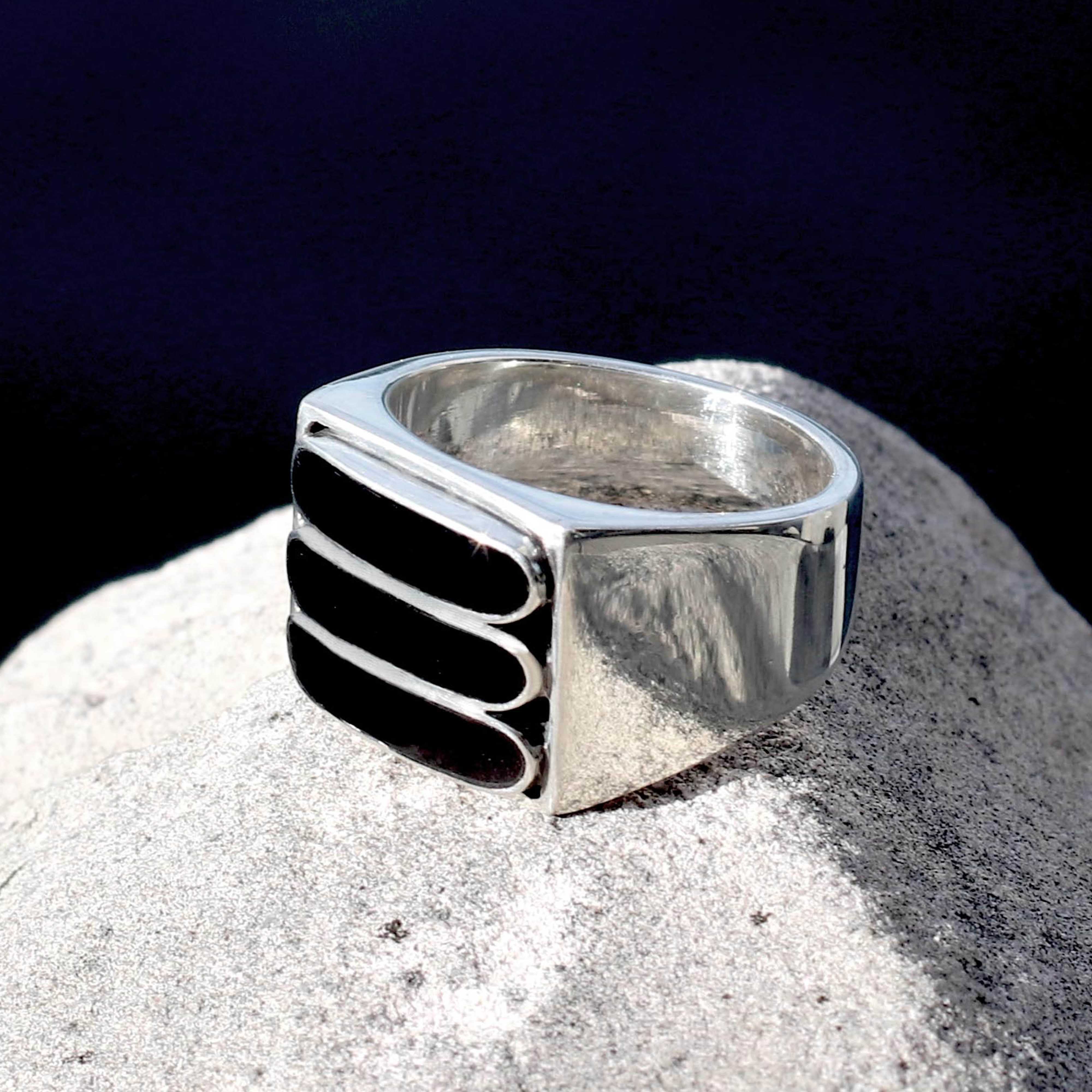 This unisex ring is paradoxically dramatic and calm. Three black shell bars are framed in slender outlines of silver. Together, they set an even tempo for the eye. The silver is of substantial and exceptional quality.