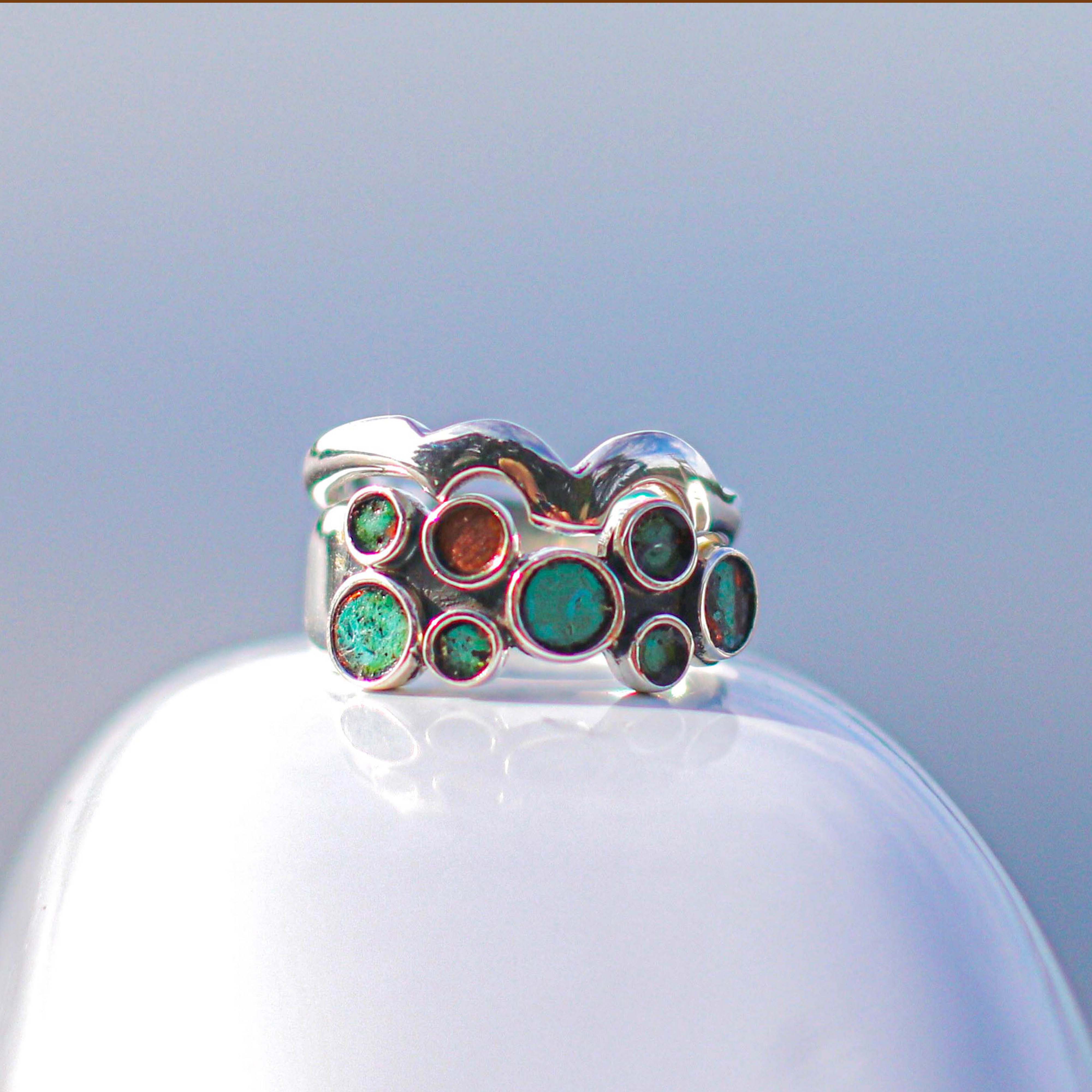 Little raw and blue copper circles dance along the top of one ring. The other ring - all silver - is shaped to fit around the contours of the first, like a crown.  *Note: a special coating has been applied to maintain the oxidized blue of the copper over time.
