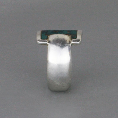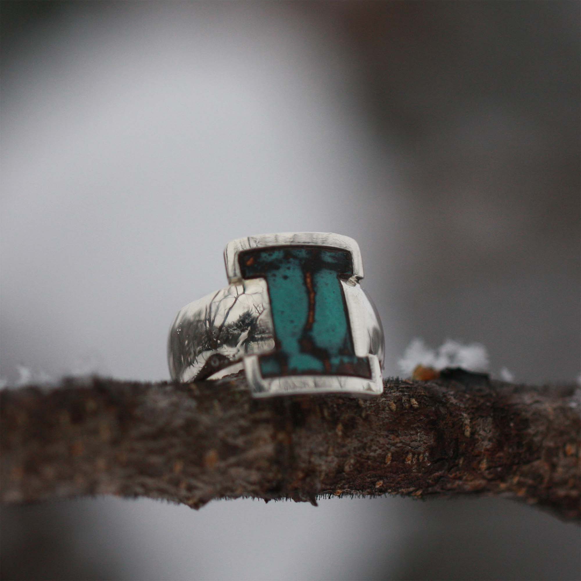 A simple slab of oxidized copper is squared off in this strong, grounded glacial blue ring. The silver band is wide and slightly rounded, making this ring exceptionally comfortable. *Note: a special coating has been applied to maintain the oxidized blue of the copper over time