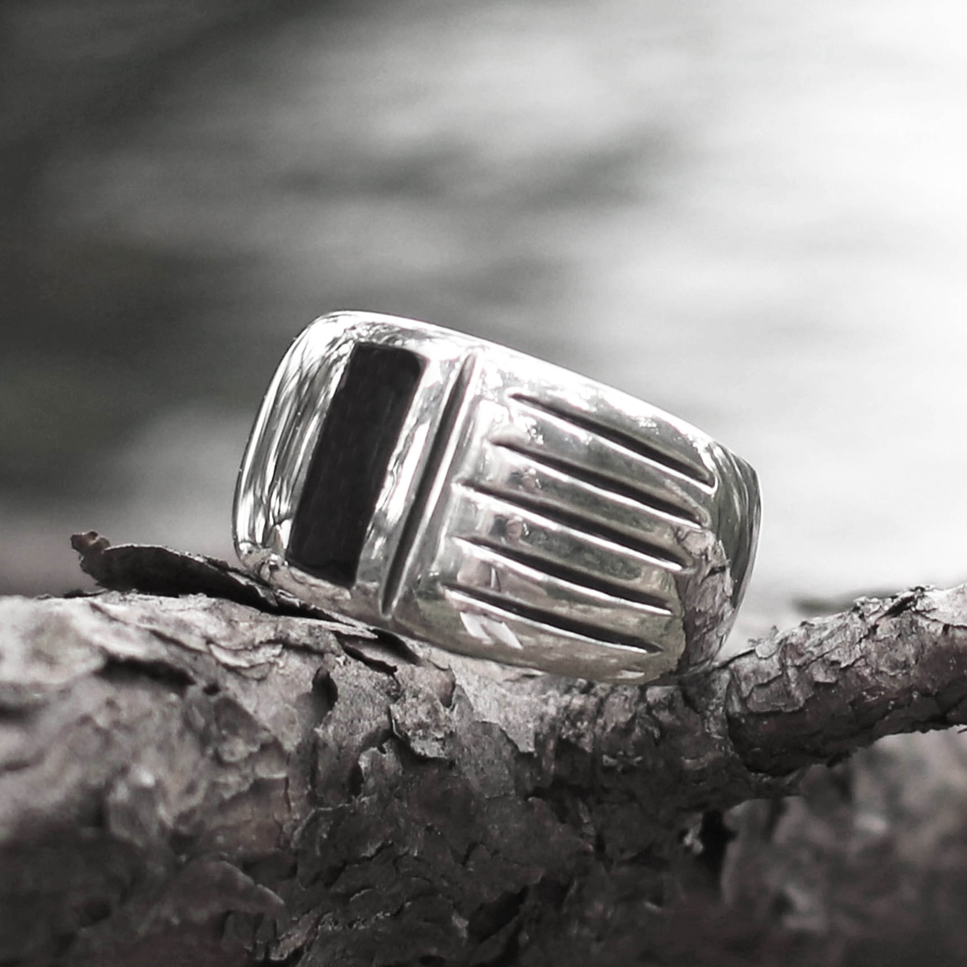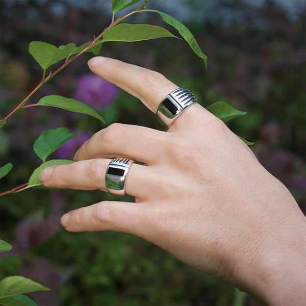 Five etched lines run along half of this ring like a staff on a sheet of music. These are interrupted by a bold vertical rectangle of black shell. The contrast makes for a simple yet striking and unusual design.